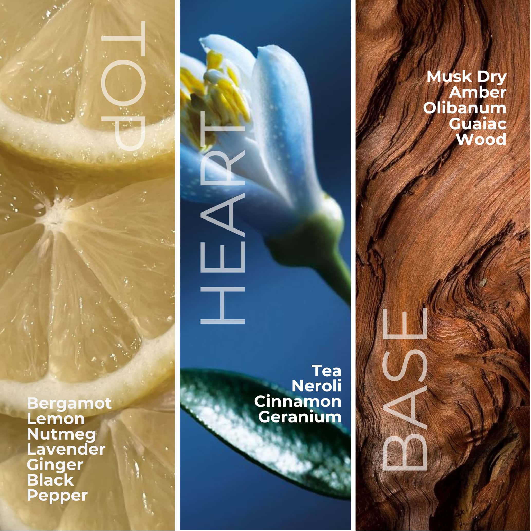 TOP: Bergamot, Lemon, Nutmeg, Lavender, Ginger, Black Pepper HEART: Tea, Neroli, Cinnamon, Geranium BASE: Musk, Dry Amber, Olibanum, Guaiac, Wood